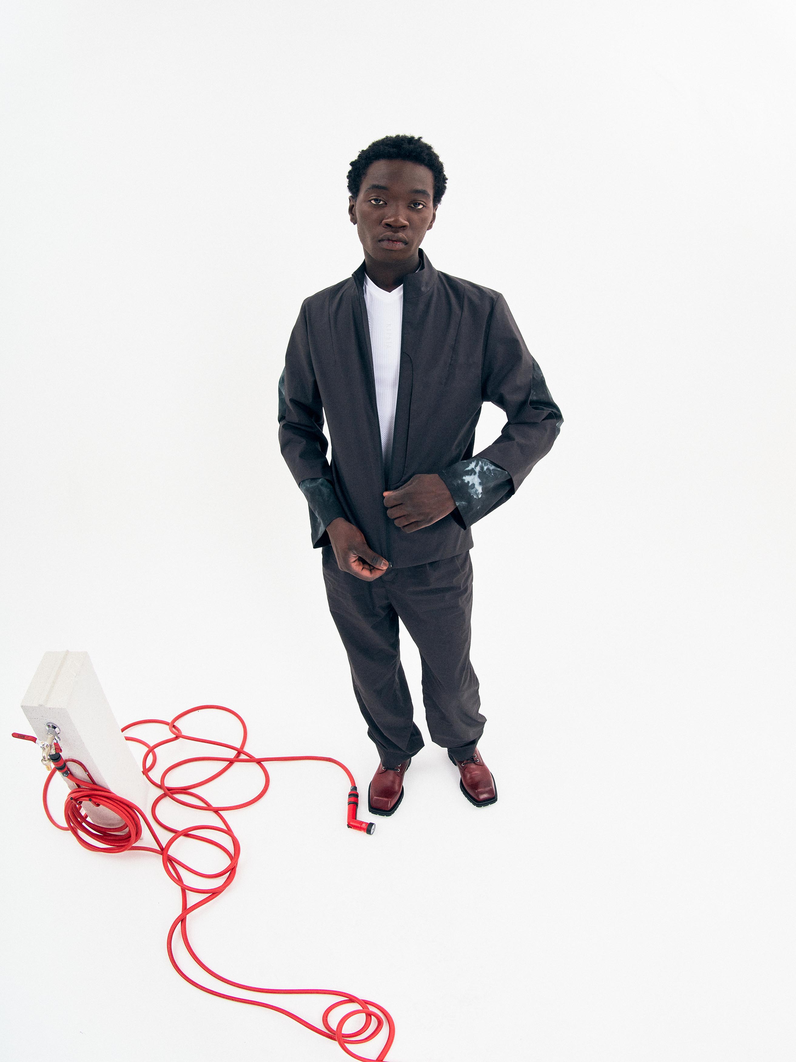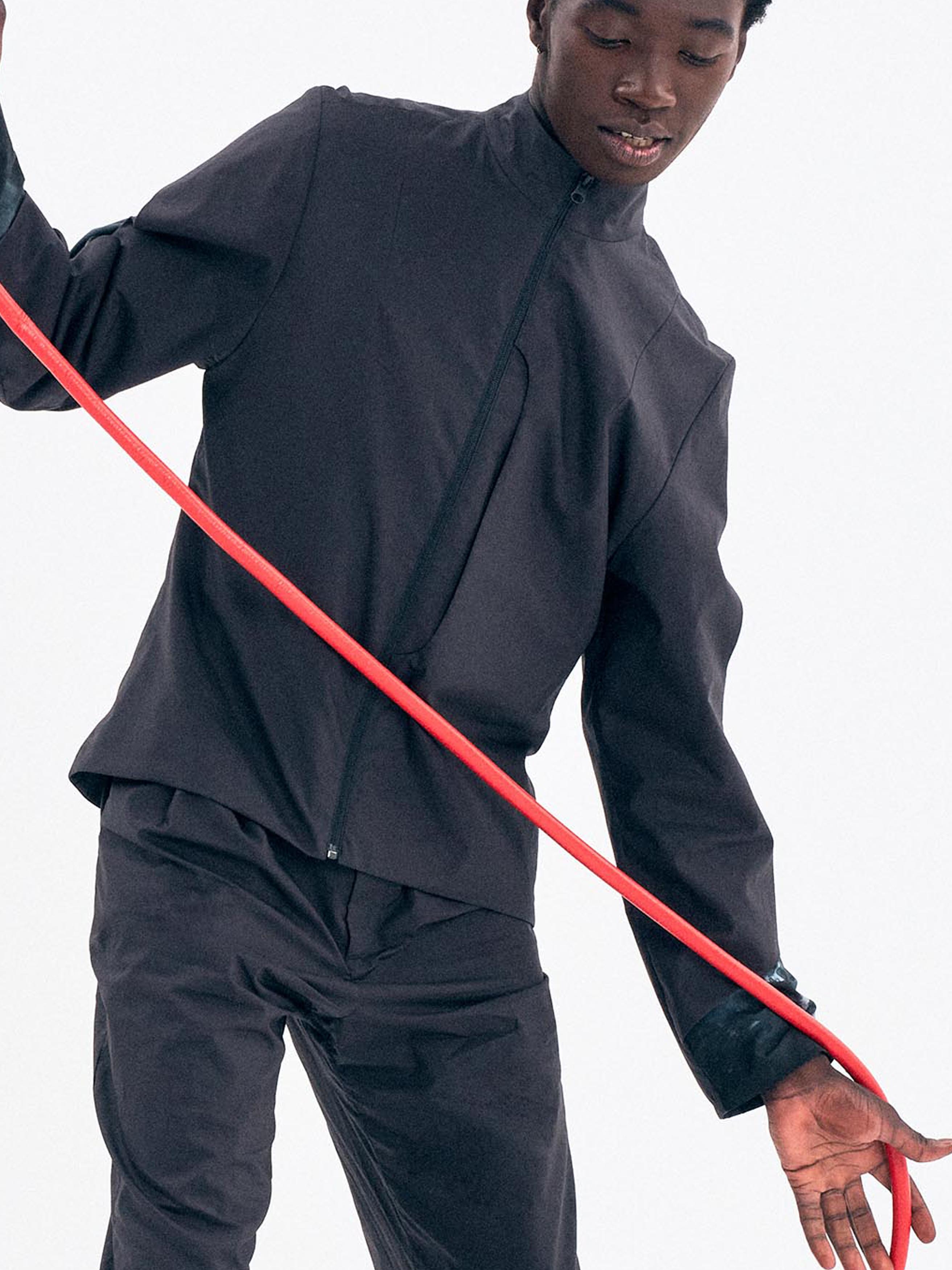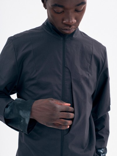 A silhouette composed of a short jacket and tailored pants made from Japanese cotton poplin. The under layer of the jacket is hand dyed by designer Bastien J. Laurent and his studio.