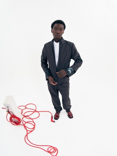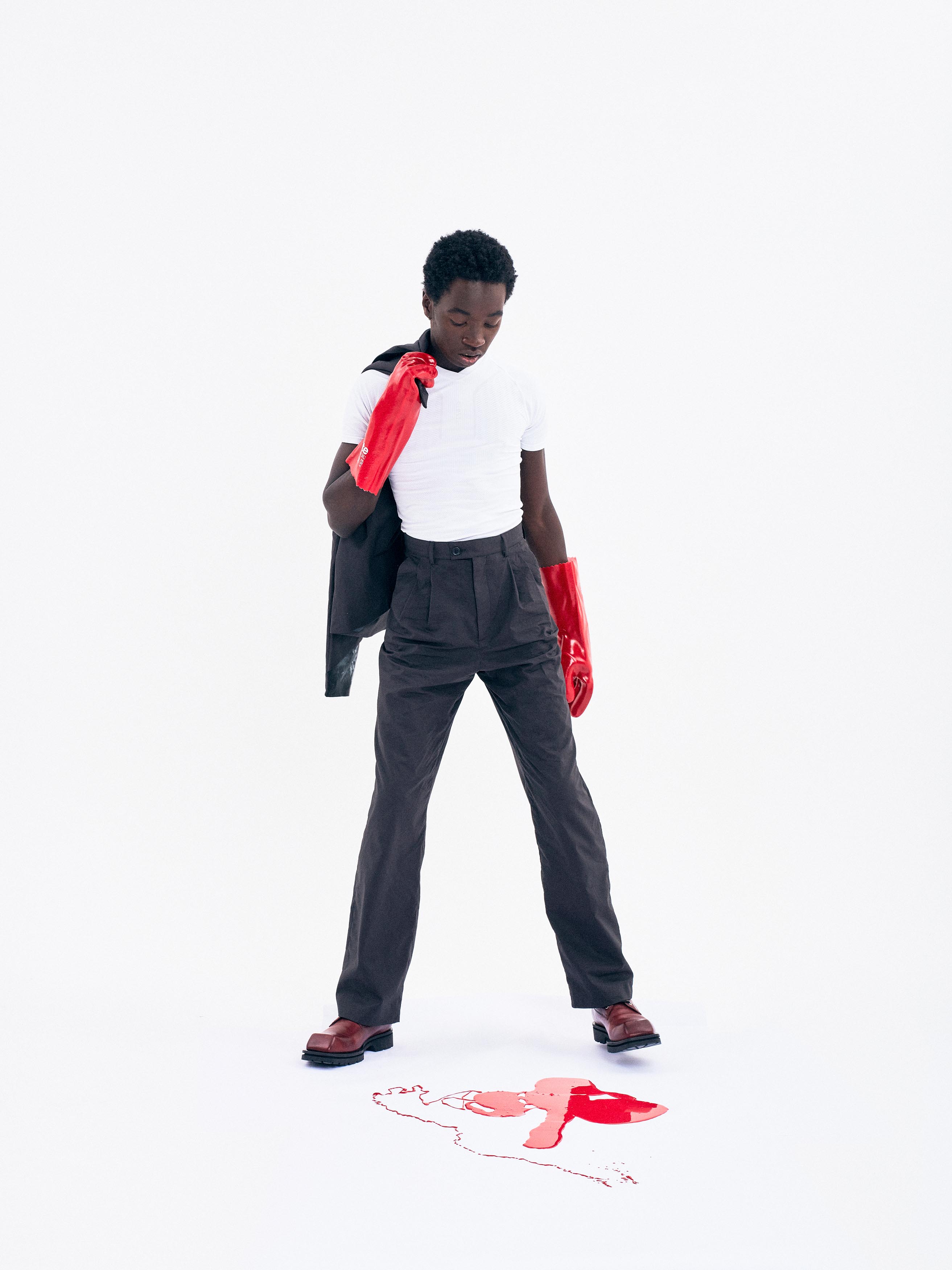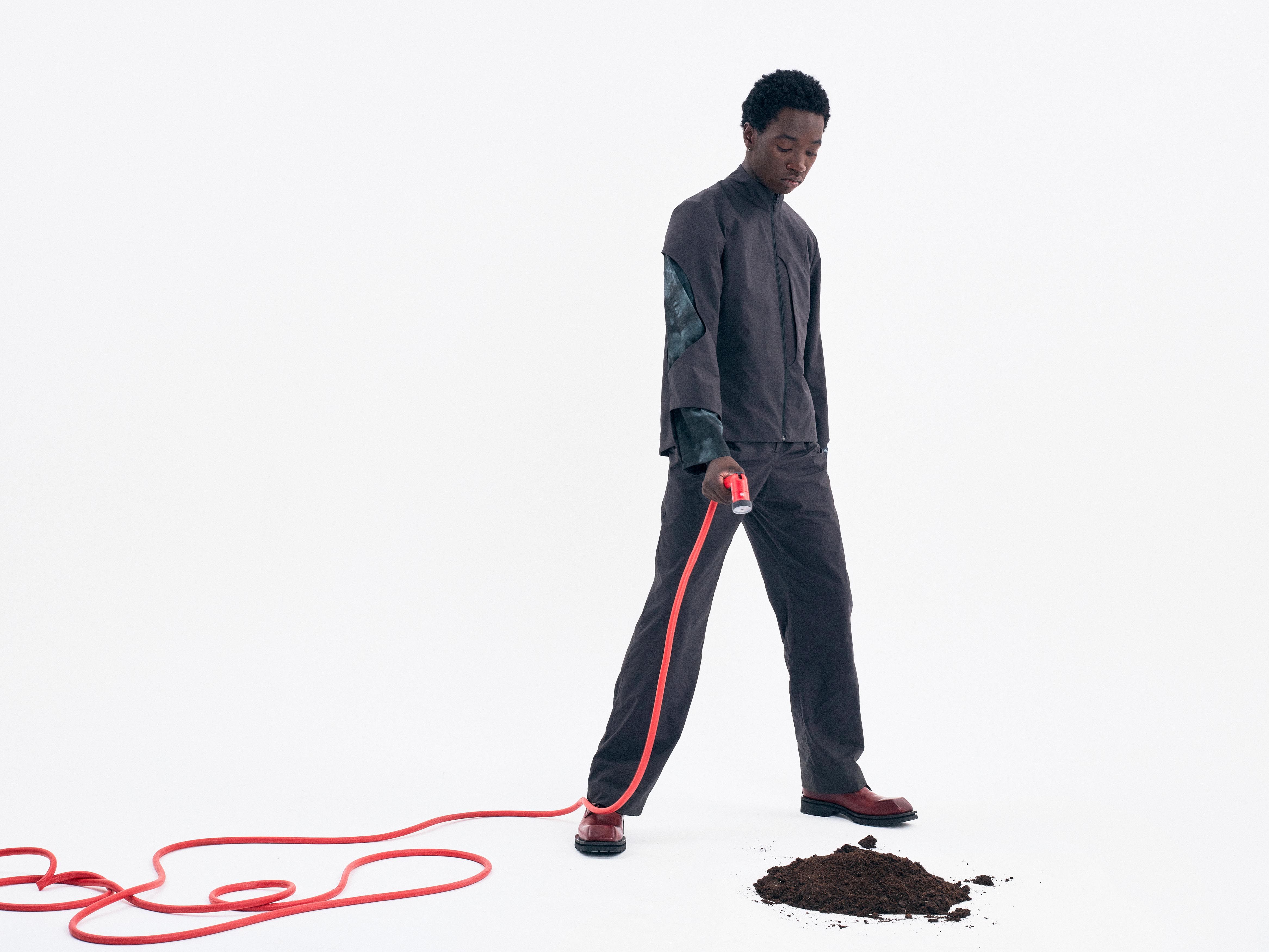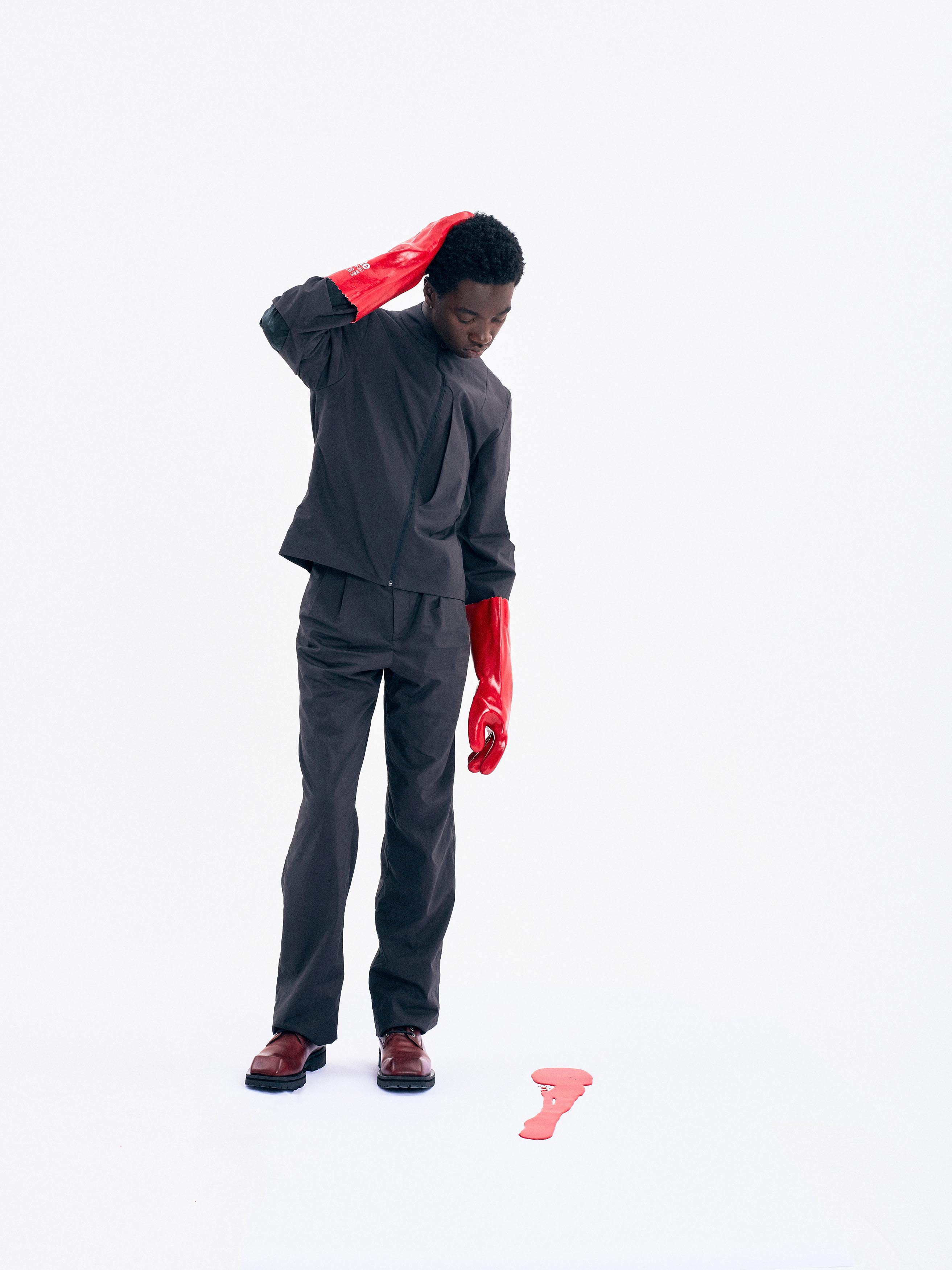 A silhouette composed of a short jacket and tailored pants made from Japanese cotton poplin. The under layer of the jacket is hand dyed by designer Bastien J. Laurent and his studio.